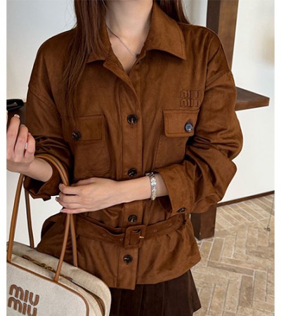 • [홍콩명품,MIU MIU] 미우미우 25SS 로고 여성 레더 가죽 셔츠 자켓 (브라운), BM23069, MC, 레플리카의류,미러급사이트