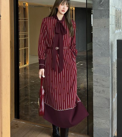 • [홍콩명품.Gucci] 구찌 25SS 로고 패턴 여성 롱 블라우스 셔츠 원피스 (와인), BM23085, MC, 레플리카의류,미러급사이트