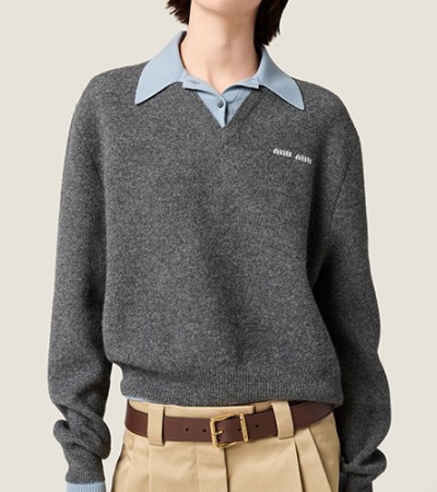 [홍콩명품,MIU MIU] 미우미우 25SS 로고 2톤 카라 셔츠 니트 스웨터 (그레이), BM23405, JL, 레플리카의류,미러급사이트 > 여성몰