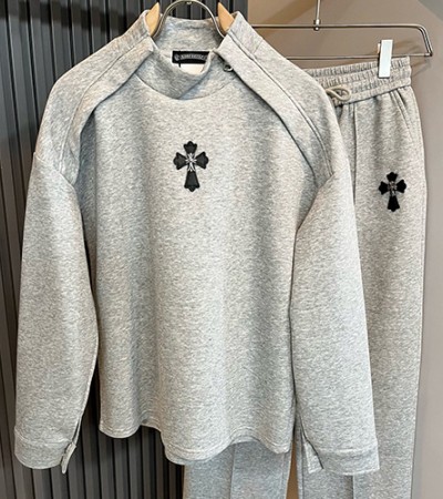 • [홍콩명품.Chrome Hearts] 크롬하츠 25SS 로고 크로스 맨투맨 티셔츠 + 조거 팬츠 바지 상하의 세트 (그레이), BM24083, KSM, 레플리카의류,미러급사이트