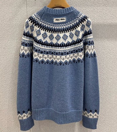 • [홍콩명품,MIU MIU] 미우미우 25SS 로고 패턴 여성 니트 스웨터 (블루), BM24085, KSM, 레플리카의류,미러급사이트