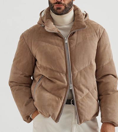 [홍콩명품.Brunello Cucinelli ] 브루넬로 쿠치넬리 25SS 로고 레더 가죽 레더 가죽 후드 구스다운 패딩 자켓 (베이지), BM24108, PG, 레플리카의류,미러급사이트 > 남자의류