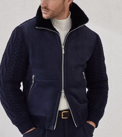 • [홍콩명품.Brunello Cucinelli ] 브루넬로 쿠치넬리 26SS 로고 하이넥 레더 가죽 캐시미어 레이어드 봄버 자켓 (네이비), BM24336, TOM, 레플리카의류,미러급사이트